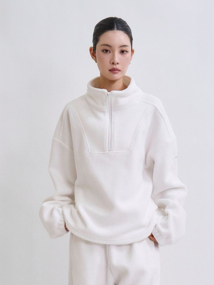 겉감은 플리스, 안감은 면 촉감의 더블 원단을 사용한 플리스 하프 집업으로 운동 시 웜업할 때나 데일리로도 다양하게 즐기기 좋은 제품입니다.